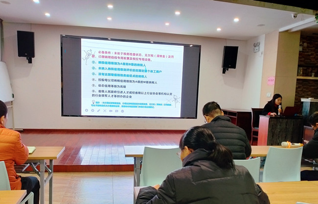 2021年12月4日,由歙縣招商投資服務(wù)中心主辦,黃山市金信財稅代理事務(wù)所有限公司承辦,金信公司點單財稅部初級會計師——謝姝主講的“稅務(wù)簡易注銷網(wǎng)上辦理操作流程”專題培訓(xùn)在一樓眾創(chuàng)空間舉行,園區(qū)企業(yè)負責(zé)人和中心財稅服務(wù)人員50余人參與此次分享。
